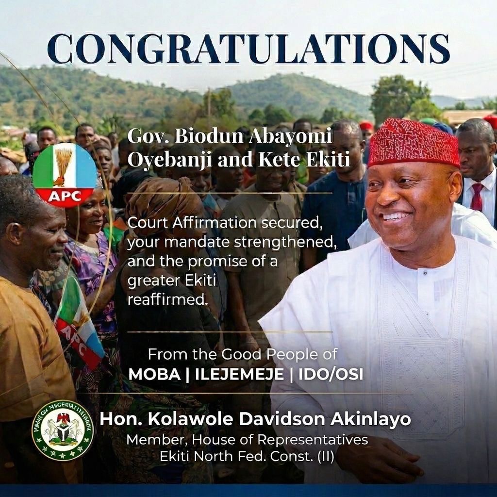 A member of the House of Representatives, Hon. Kolawole Davidson Akinlayo, has congratulated Governor Biodun Abayomi Oyebanji following a Federal High Court ruling affirming him as the All Progressives Congress (APC) candidate for the 2026 governorship election in Ekiti State.